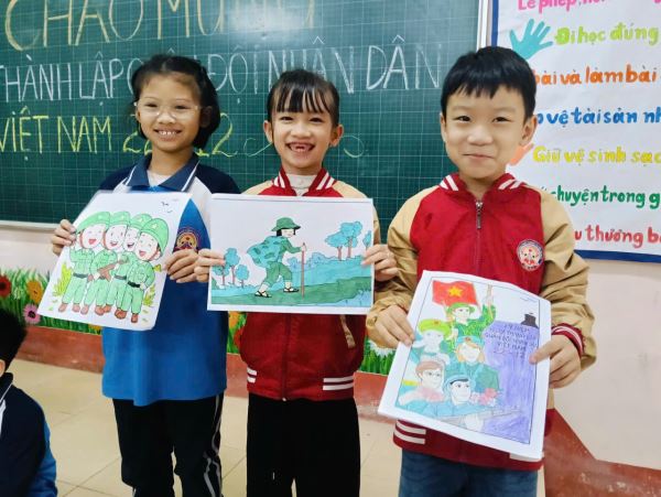 Thông qua các hoạt động phù hợp với lứa tuổi, học sinh được tham gia vẽ tranh, tô màu về hình ảnh Bộ đội Cụ Hồ, Quân đội Nhân dân Việt Nam. Những bức tranh với màu sắc tươi sáng, nét vẽ hồn nhiên đã thể hiện tình cảm trong sáng, sự ngưỡng mộ và yêu mến của các em dành cho các chú bộ đội, những người luôn ngày đêm bảo vệ Tổ quốc.