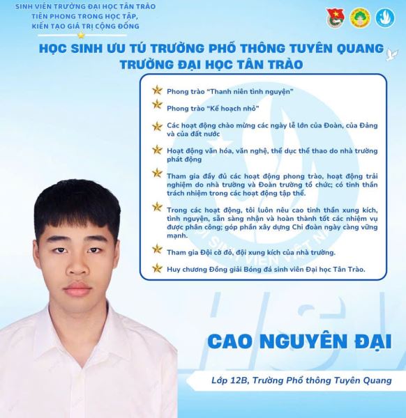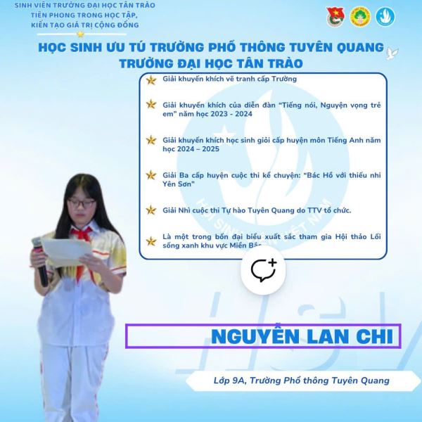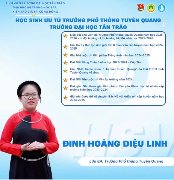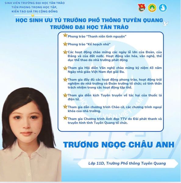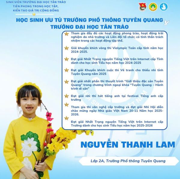 Đây là các tấm gương tiêu biểu trong học tập, rèn luyện đạo đức, tích cực tham gia các phong trào thi đua, hoạt động Đoàn – Đội, các hoạt động tình nguyện vì cộng đồng; qua đó góp phần lan tỏa hình ảnh đẹp của học sinh Trường Phổ thông Tuyên Quang chăm ngoan, giàu nghị lực, trí tuệ và khát vọng vươn lên.